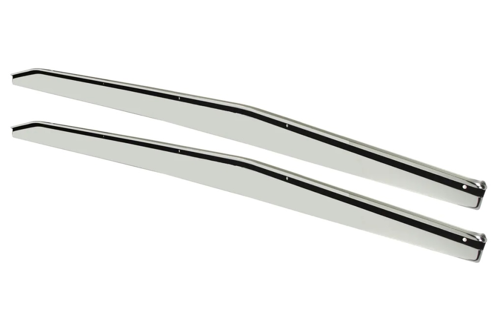 These side fender lower rocker trim panels are bright polished aluminum with a clear anodizing and a black painted strip. It is attached to the body with black oxide, Phillip’s oval head screws.